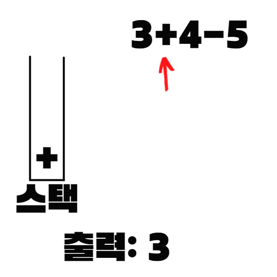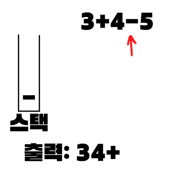 -는 연산자이므로 push를 하는데, 이미 스택에 자신과 사칙연산 우선순위가 동등한 +가 있으므로 +를 pop하고 -를 push한다