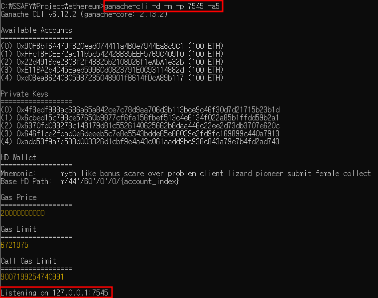 현재 계정 5개가 만들어져 있고 각 계정마다 100 이더씩 들어있는 상황