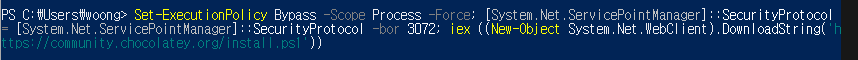 Set-ExecutionPolicy Bypass -Scope Process -Force; [System.Net.ServicePointManager]::SecurityProtocol = [System.Net.ServicePointManager]::SecurityProtocol -bor 3072; iex ((New-Object System.Net.WebClient).DownloadString('https://community.chocolatey.org/install.ps1'))